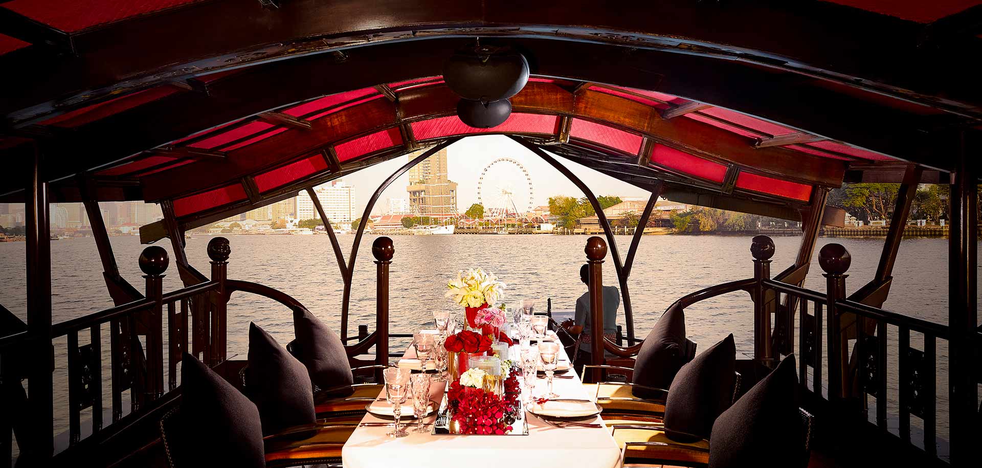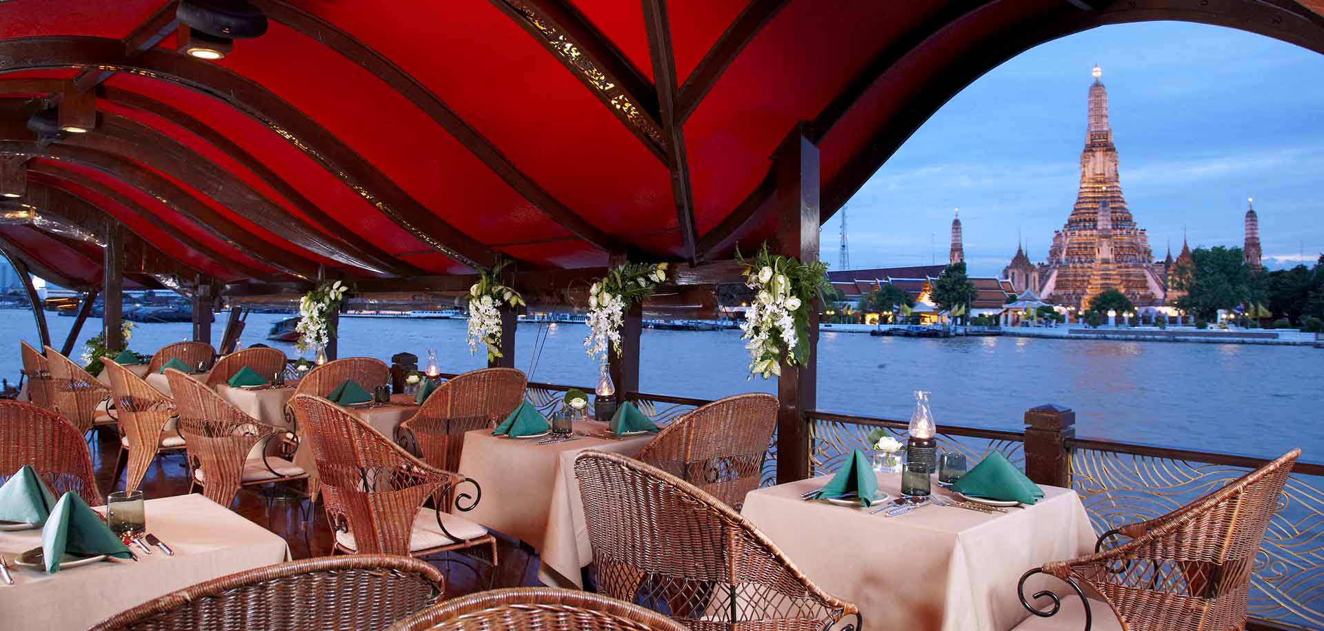 Welcome to a world on the river, full of history, sights and sounds. Experience a romantic journey on the Chao Phraya River on board the luxury Anantara Rice Barge Dinner Cruise with warm Thai hospitality and discreet attentive service. Cruising down the river, the Manohra will show you Bangkok by night while spectacular and memorable Thai culinary delicacies are served. Up to 40 guests can enjoy en route views of the famous Wat Arun (The Temple of Dawn), the magnificent Grand Palace, The Royal Barge Boathouse and numerous other temples and fascinating landmarks.