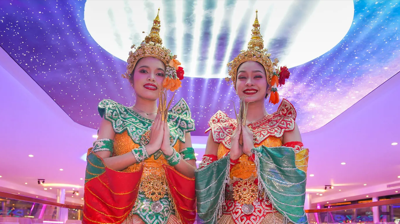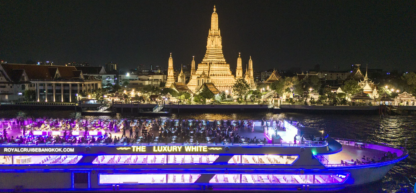 As you glide along the Chao Phraya River in Bangkok, you'll be treated to views of towering temples lit up at night, like Wat Arun, the Temple of Dawn, and Wat Phra Kaew, where the Emerald Buddha has sat for over two hundred years. As the river bends, head to the top deck to see the Grand Palace in all its glory, with its gold-leaf-wrapped turrets and spires. Then, relax as the Thai cabaret show begins onboard and you're served a buffet of typical Thai and international dishes.